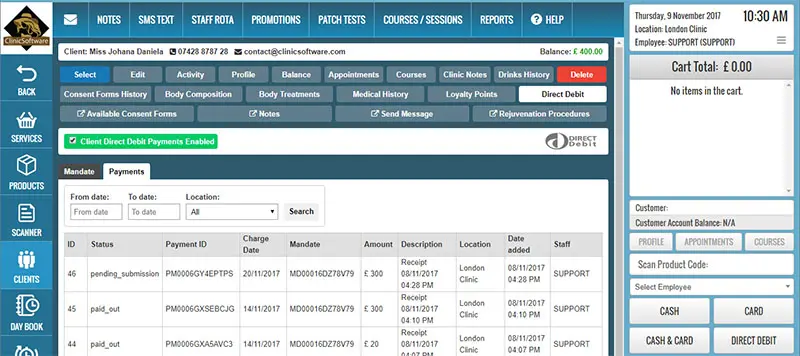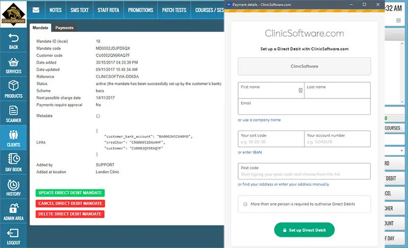 Automate setting up Direct Debit mandates, then manage and reconcile all your payments automatically from within ClinicSoftware.